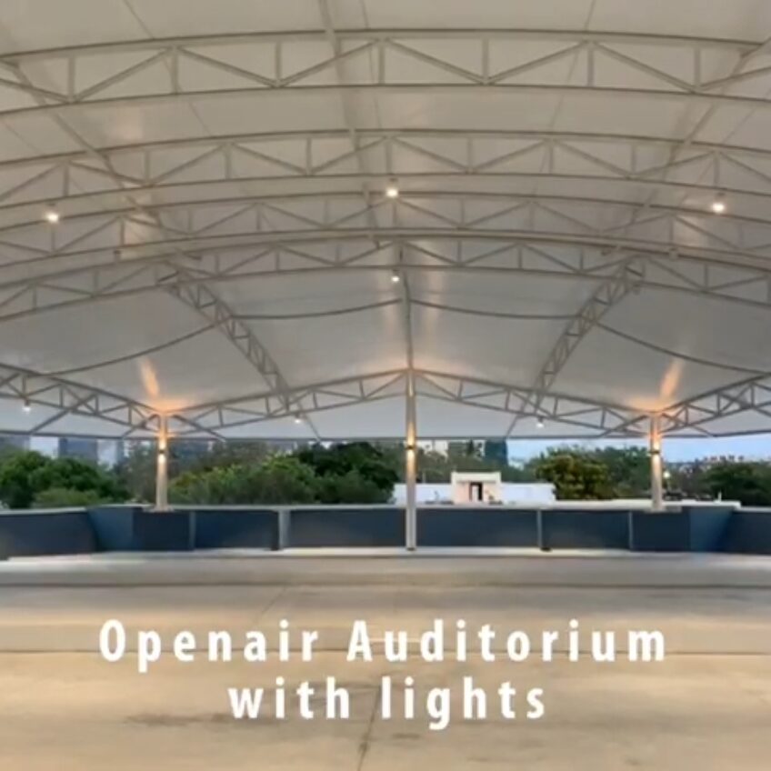 There are two spaces available for booking: an air-conditioned hall on the ground floor and an open-air space on the roof. The air-conditioned hall has a well-designed stage and a seating capacity of 250 persons. The open-air space is sheltered by a tensile roof and can seat up to 500 persons. Both these spaces come with ample parking space, modern facilities and lighting arrangements; they can be booked individually.